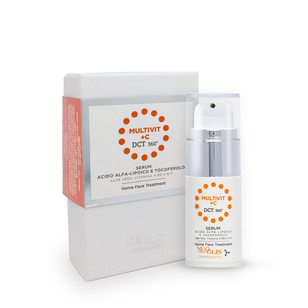 MULTIVIT C è un siero a base di Aloe Vera, Vitamina A, B5, C, E, F, Acido Alfa-Lipoico e Tocoferolo. Ideale per pelli normali, miste e spente che ritrovano così luminosità e turgore e per pelli con macchie, che grazie alle proprietà schiarenti della Vitamina C, giorno dopo giorno, ritrovano la loro compattezza e uniformità di colorito.