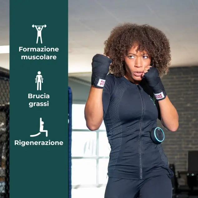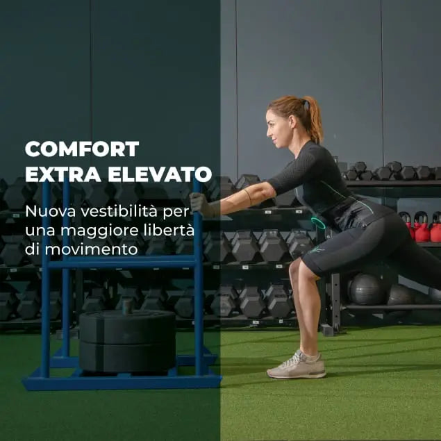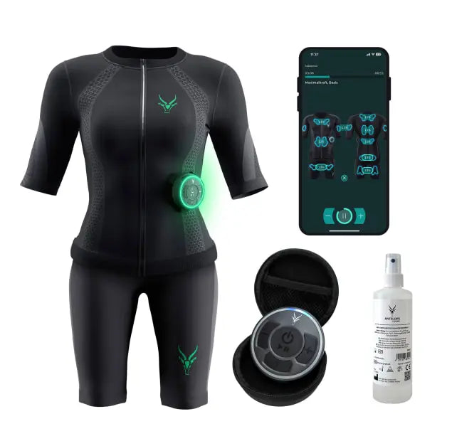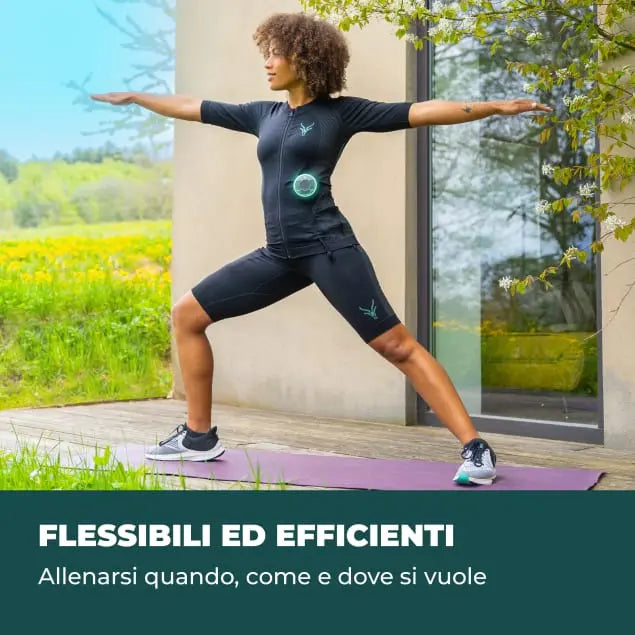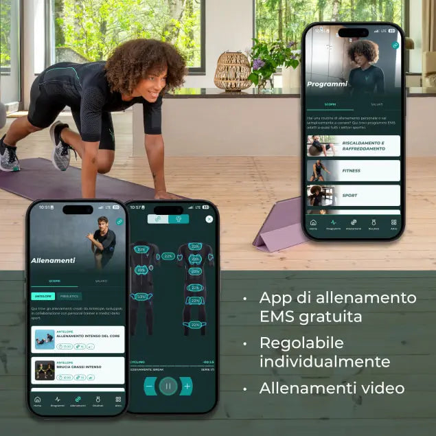 • Tuta da allenamento EMS composta da maglietta, pantaloncini, booster e app gratuita con allenamenti inclusi